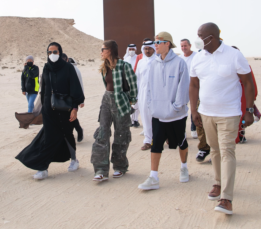 Her Excellency Sheikha Al Mayassa bint Hamad bin Khalifa Al Thani (left), Justin & Hailey Bieber (middle) in the Qatar Desert in Doha. Photo Courtesy of Qatar Museums