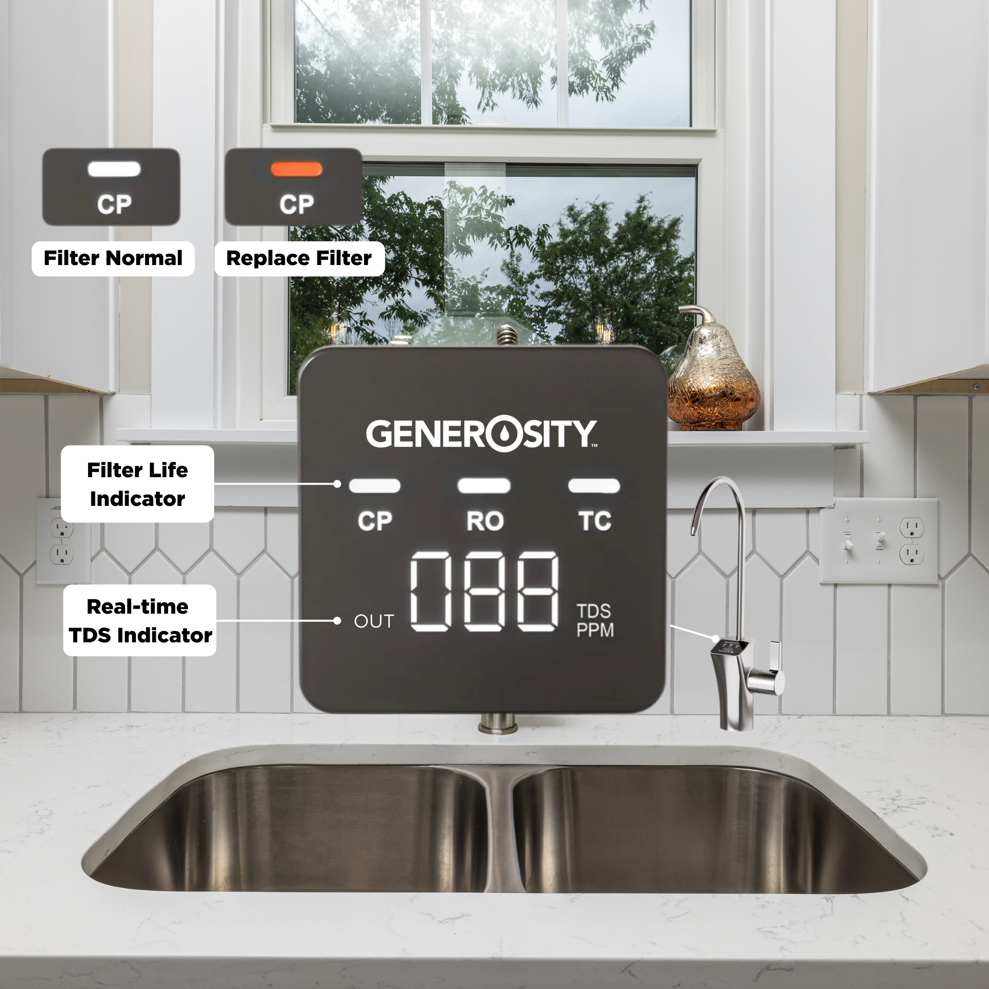 The Generosity™ Home WTR HUB’s compact and sleek filter system with a small and convenient footprint takes up less space and saves storage under kitchen sink! No tank also means no more secondary pollution. Guaranteed to provide ultra-pure, safe and clean water for you and your family.